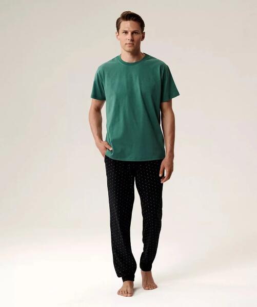 Férfi pizsama- puha pamut kötött anyag barackos hatással- rövid ujjú póló- kerek nyakkivágás- bő, hosszú, mintás nadrág- rugalmas derékrész kötött szegéllyel és megkötőzsinórral a derék beállításához- kényelmes zsebek a csípőnÖsszetétel: 100% pamut