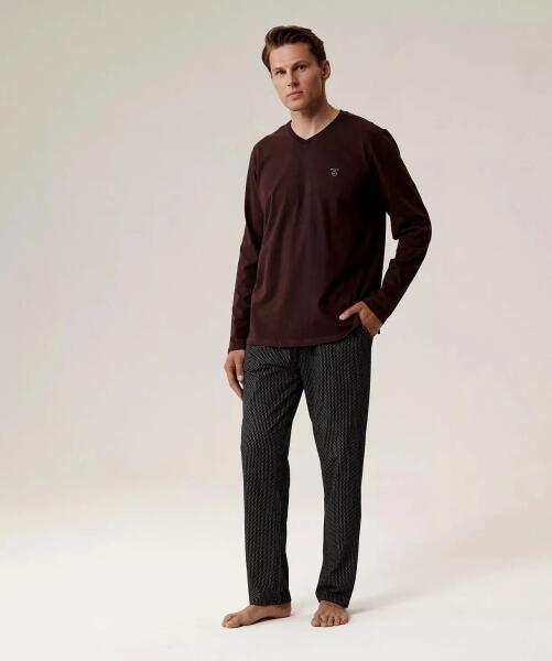 Férfi pizsama- puha pamut kötött anyag barackos hatással- hosszú ujjú póló- V-nyakú- bő, hosszú, mintás nadrág- rugalmas derékrész kötött szegéllyel és megkötőzsinórral a derék beállításához- kényelmes zsebek a csípőnÖsszetétel: 100% pamut