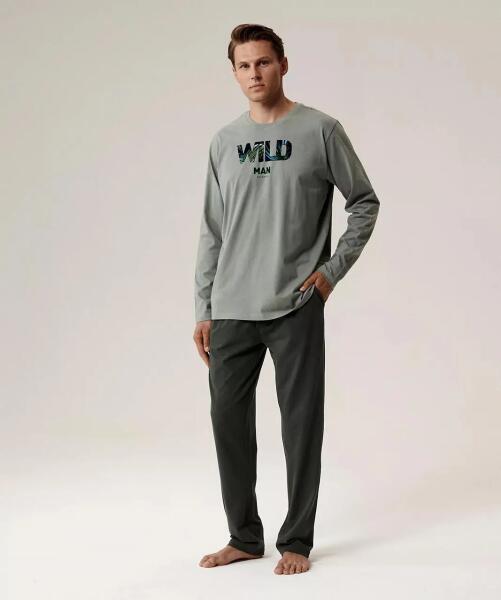 Férfi pizsama- puha, kényelmes kötött anyag "barackos" hatású- hosszú ujjú pulóver- dekoratív WILD felirat az elején- hosszú, egyszínű nadrág