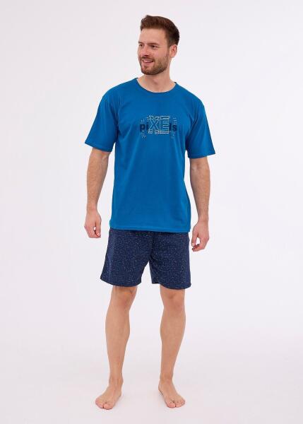 Férfi pizsama - kiváló minőségű pamutból készült - rövid ujjú póló - az elején apró nyomattal díszített - félköríves nyakkivágás - mintás rövidnadrág - rugalmas derék Összetétel: 100% pamut