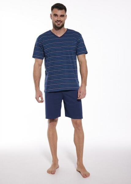 Pamut férfi pizsama - rövid ujjú csíkos póló - V-alakú nyakkivágás - sima rövidnadrág Összetétel: póló 92% pamut, 8% poliészter; nadrág 100% pamut
