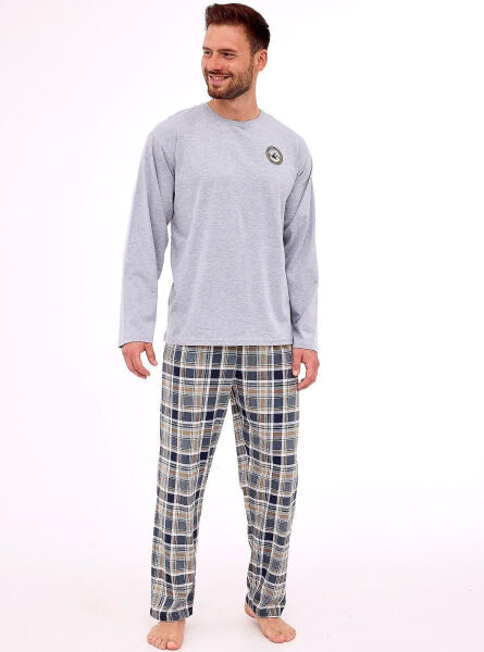 Férfi pizsama - melange ing hosszú ujjal - félkör alakú nyakkivágás - kis apró betűs - hosszú kockás nadrág - kényelmes rugalmas derékrész Összetétel: póló 92% pamut, 8% poliészter; nadrág 100% pamut