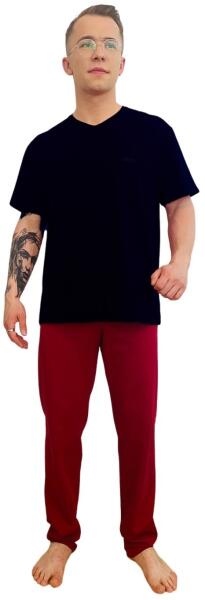 Rövid ujjú férfi pizsama. V-nyakú, hosszú nadrág a készlethez. Anyaga: 95% pamut, 5% elasztán
