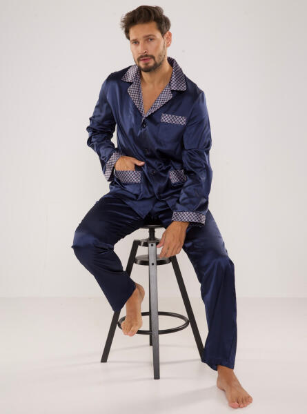Elegáns férfi szatén pizsama klasszikus szabással. Felsőrésze V-kivágású, gombolható gallérral. A hosszú alkalmi nadrág elasztikus derékpánttal rendelkezik. Anyaga: 97% poliészter, 3% elasztán
