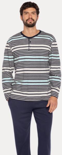 A felsőrész hosszú ujjú, modern csíkos mintával, a nyakrész kis gombokkal díszített. A nadrág egyszínű, sötétkék, praktikus zsebekkel.