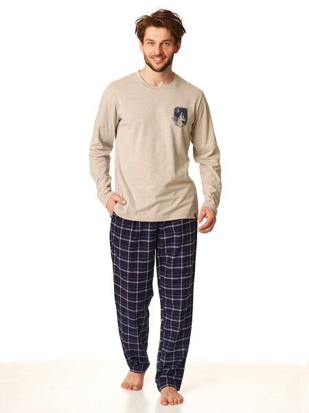 Férfi pizsama Key. Melange póló hosszú ujjal. Kis betűkkel díszítve. Kockás pamut flanelből készült hosszú nadrág. Zsebekkel. Kényelmes elasztikus derékrész. Anyaga: ing 60% pamut, 40% poliészter, nadrág 100% pamut flanel