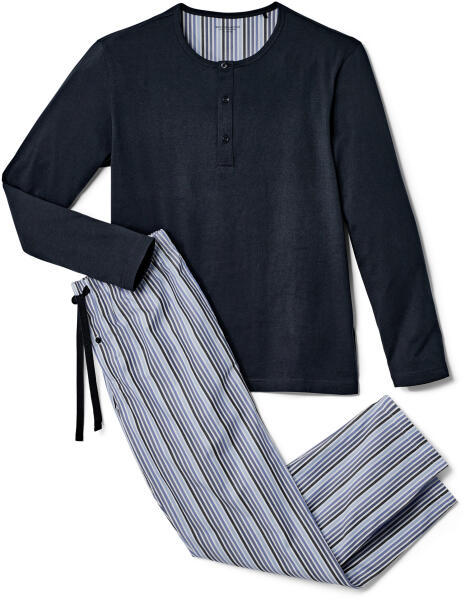 Férfi pizsama, szövött nadrággal, csíkos/sötétkék Szín: Sötétkék felsőrész Sötétkék-világoskék-fehér csíkos nadrág Anyag: 100% pamut Méretek: Felsőrész teljes hossza: kb. 77 cm Nadrág belső szárhossza: kb. 79 cm (L 52/54-es méret) Fazon: Regular Fit Tiszta pamutbólA felsőrész puha single jersey anyagból, a nadrág szövött pamutbólA nadrág gombos sliccel, 2 oldalsó bevágott zsebbel és megkötős, rugalmas derékpánttalTámogatja a Cotton made in Africa kezdeményezéstEz a pizsama támogatja a termelőket.