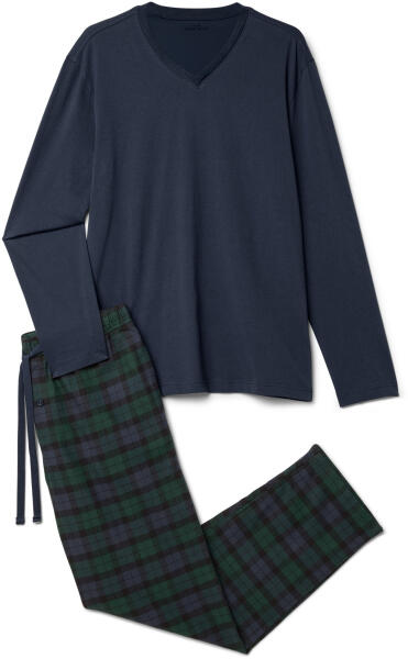 Férfi pizsama flanelnadrággal, kék-zöld Szín: Felsőrész: sötétkék Zöld-sötétkék-fekete kockás Anyag: 100% pamut (támogatja a Cotton made in Africa kezdeményezést) Méretek: Felsőrész teljes hossza: kb. 77 cm Nadrág belső szárhossza: kb. 79 cm (L 52/54-es méret) Fazon: Regular Fit A felsőrész single jersey anyagból, a nadrág puha flanelbőlTiszta pamutA nadrág gombos sliccel, megkötős gumis derékpánttal és 2 oldalsó bevágott zsebbelFelsőrész V-nyakkivágássalTámogatja a Cotton made in Africa kezdeményezéstFlanel nadrággalEz a pizsama támogatja a termelőket.