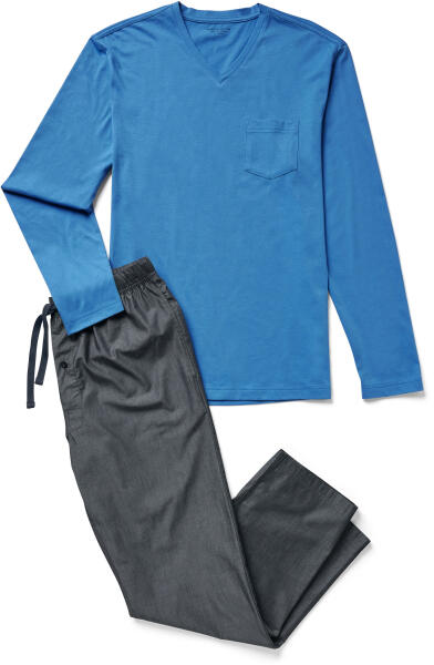 Férfi pizsama szövött nadrággal, sötétkék/kék Szín: Felsőrész: kék Nadrág: sötétkék chambray Anyag: 100% pamut (támogatja a Cotton made in Africa kezdeményezést) Méretek: Felsőrész teljes hossza: kb. 77 cm Nadrág belső szárhossza: kb. 79 cm (L 52/54-es méret) Fazon: Regular Fit Tiszta pamut – a nadrág szövött anyagból A felsőrész V-nyakkivágással és mellzsebbelA nadrág gombos sliccel, 2 oldalsó bevágott zsebbel és megkötős, rugalmas derékpánttalSzövött nadrággalTámogatja a Cotton made in Africa kezdeményezéstEz a pizsama támogatja a termelőket.