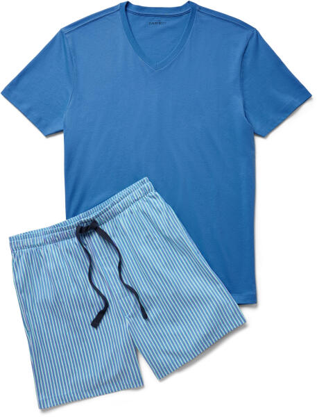 Rövidnadrágos pizsama Szín: Felsőrész: kék Nadrág: kék-türkiz-fehér csíkos Anyag: 100% pamut (támogatja a Cotton made in Africa kezdeményezést) Méretek: Felsőrész teljes hossza: kb. 77 cm Nadrág belső szárhossza: kb. 16 cm (L 52/54-es méret) Fazon: Regular Fit Rövid férfi hálóruha puha single-jersey anyagbólA nadrág oldalsó bevágott zsebekkel, rugalmas, gumis derékpánttal és megkötőkkelFelsőrész V-nyakkivágássalOnline 4XL-es méretigTámogatja a Cotton made in Africa kezdeményezéstEz a pizsama támogatja a termelőket.