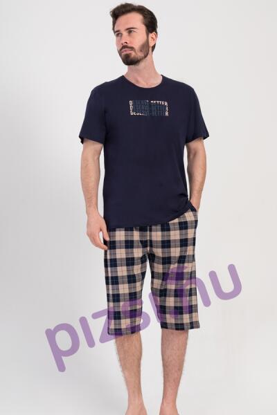 Extra méretű halásznadrágos férfi pizsama: rövid ujjú halásznadrágos pamut férfi pizsama. Felső része egyszínű nyomott mintával kerek nyakkivágással  Nadrágja kockás rugalmas derékrésszel kényelmes viseletet biztosít. Anyaga puha tapintású: 100% pamut.