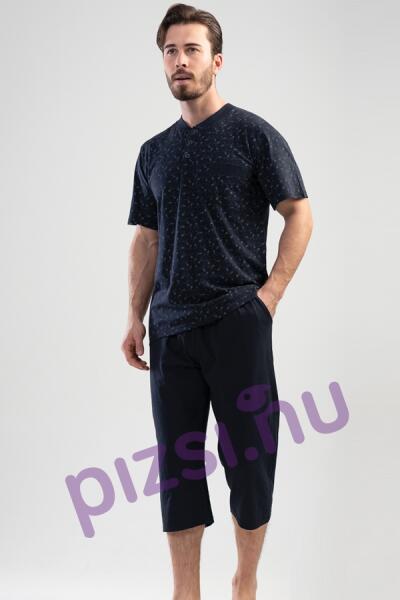 Rövid ujjú halásznadrágos pamut férfi pizsama. Felső része nyomott mintával "V" gombolható nyakkivágással  Nadrágja egyszínű rugalmas derékrésszel zsebbel ellátva kényelmes viseletet biztosít. Anyaga puha tapintású: 50% pamut 50% poliészter.