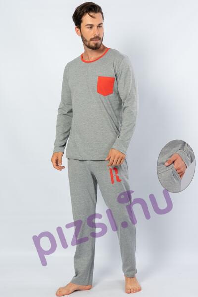 Nagy méretű pizsama: felső része kerek nyakkivágással egyszínű szürke kis nyomott mintával. Nadrágja egyszínű szürke zsebbel ellátva rugalmas derékrésszel kényelmes viseletet biztosít. Anyaga puha tapintású: 70% pamut 30% poliészter.