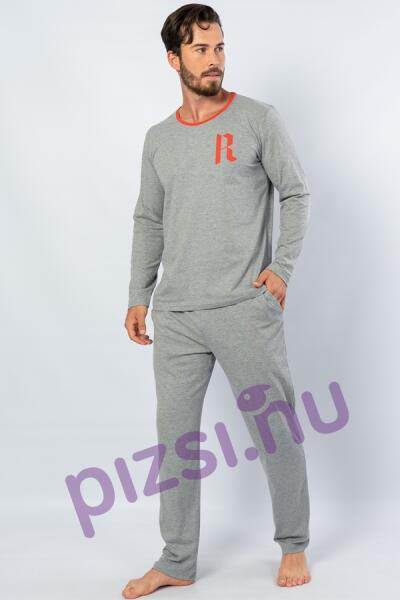 Férfi pamut pizsama: felső része kerek nyakkivágással egyszínű nyomott mintával. Nadrágja egyszínű szürke zsebbel ellátva rugalmas derékrésszel kényelmes viseletet biztosít. Felsőrész anyaga: 7 0% pamut 30% poliészter. Alsórész anyaga:  7 0% pamut 30% poliészter.