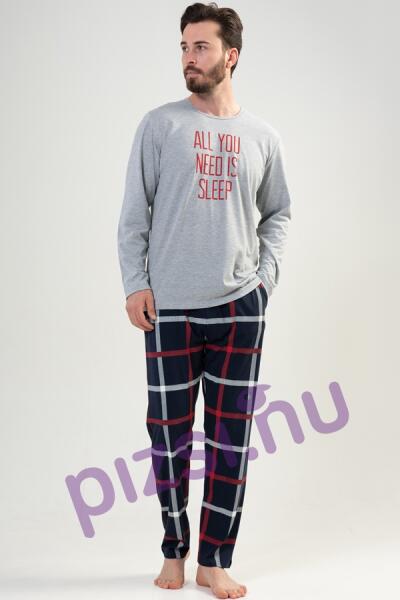 Férfi pizsama: felső része kerek nyakkivágással egyszínű szürke nyomott mintával. Nadrágja kockás mintával zsebbel ellátva rugalmas derékrésszel kényelmes viseletet biztosít. Felsőrész anyaga puha tapintású: 70% pamut 30% poliészter. Nadrág anyaga puha tapintású: 100% pamut.