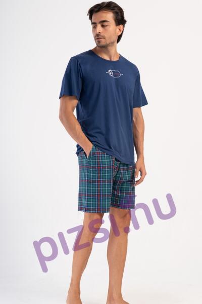 Rövid ujjú rövidnadrágos pamut férfi pizsama. Felső része nyomott mintával kerek nyakkivágással. Nadrágja kockás nyomott mintával oldalzsebbel rugalmas derékrésszel kényelmes viseletet biztosít. Anyaga puha tapintású: 100% pamut.